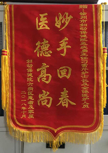 錦旗贈我院孟慶勇(yǒng)主任、刁雪琴(qín)護士長及全體醫護人員