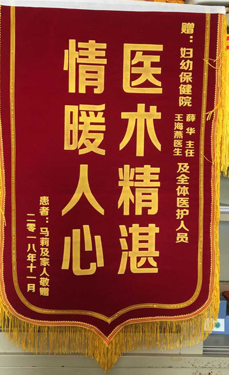 馬莉贈錦旗感謝我院薛華、王海燕醫生及全體醫護人員