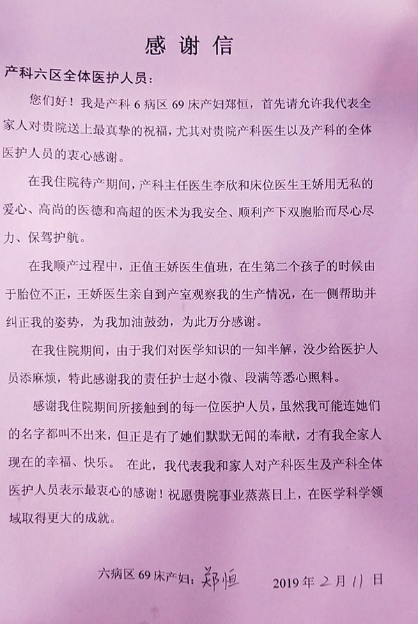 鄭恒致信感謝我(wǒ)院李欣(xīn)、王嬌及全體醫護人員