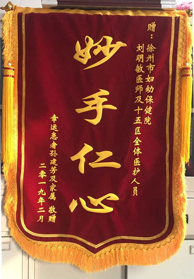 孫建芳贈錦旗(qí)感謝我院劉(liú)明(míng)敏醫生及十(shí)五病(bìng)區全體醫護人員