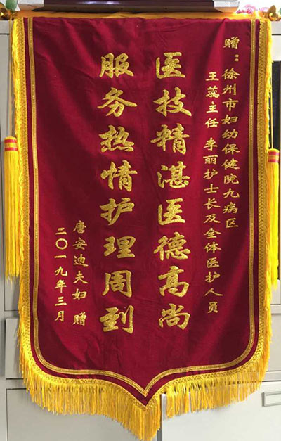 唐安迪夫婦贈錦(jǐn)旗感(gǎn)謝我院九病區送王蕊、李麗及全體他醫護人員