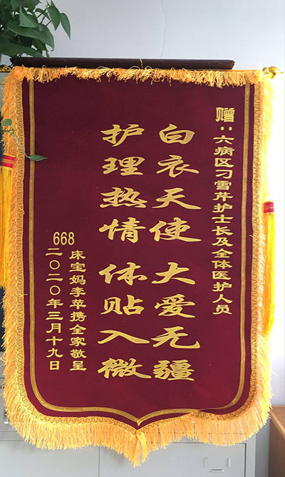 李蘋贈錦旗感(gǎn)謝我院六病區孟慶勇及全體醫護人員