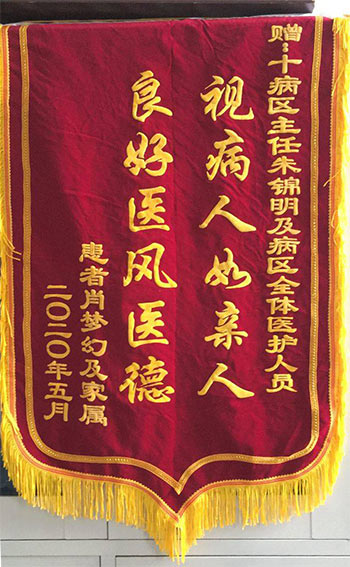 肖夢幻贈錦旗感(gǎn)謝我院十病區朱錦明及全體醫護(hù)人員