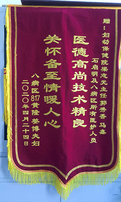 黃隆贈(zèng)錦(jǐn)旗感謝我院梁誌元、郭秀(xiù)香、馬鑫、石(shí)啟明及全體醫護人員