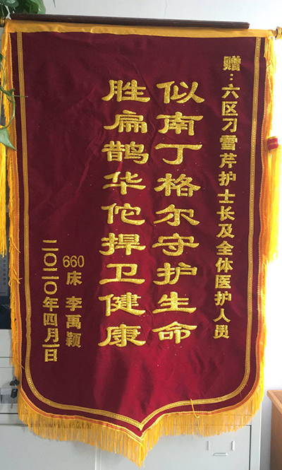 李禹穎(yǐng)贈錦旗感(gǎn)謝我院六病區刁(diāo)雪芹及全(quán)體醫護(hù)人員
