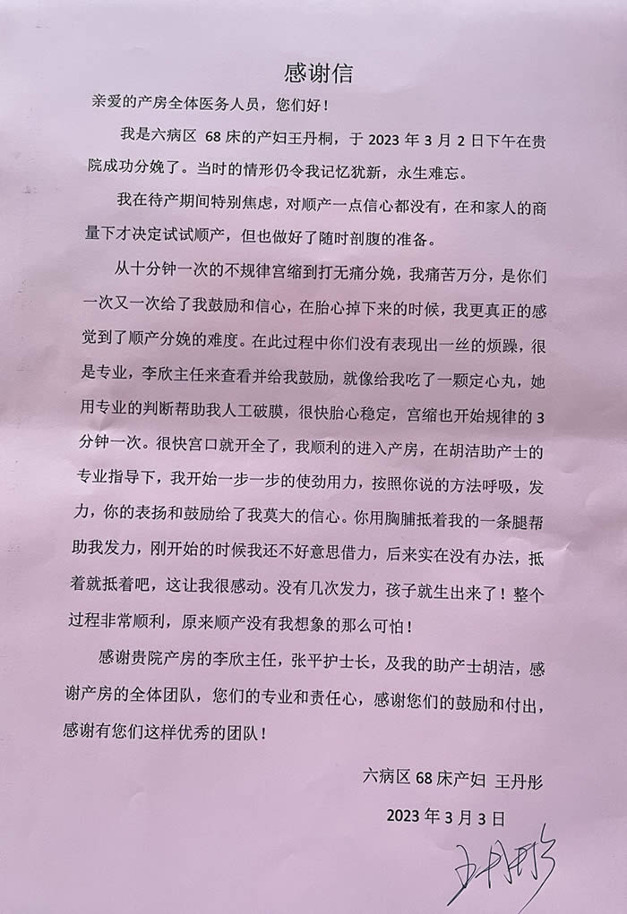 王丹彤致信感謝我院六病區李欣、張平、胡潔及全體團隊