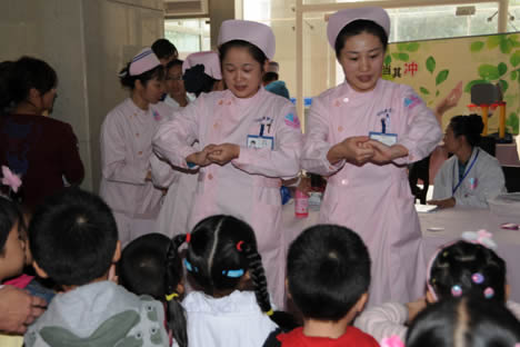 在門診大廳布置了手衛生宣傳圖版、宣傳吊旗、有獎答題、洗手的五個重要時(shí)刻趣味遊戲,發放彩色宣傳資料;醫務人員以及婦女、兒童現場學習如何正確洗手,黃院長在大廳親(qīn)自教過往(wǎng)的病人陪人正確洗手,氣氛熱烈,取得了較好的效果。