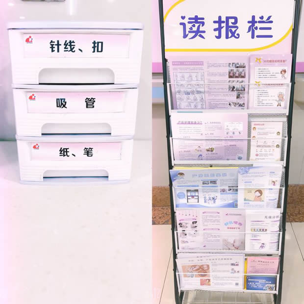 護(hù)士(shì)站(zhàn)設置便利箱,為您貼心準備吸管、針線等,以便您不時之需。病房(fáng)走廊的宣傳手冊,讓您更好更多的了(le)解產(chǎn)前產後的注意事項。