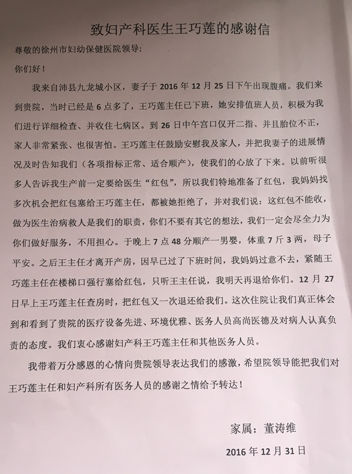 患者致信感謝(xiè)產科王巧蓮主任醫師及醫護人員