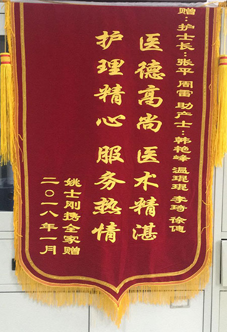 錦旗贈護士長張平、周雷,助產士韓豔峰、溫琨琨、李琦、徐僡