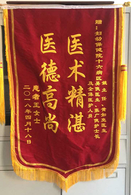 錦旗贈我院十六病區姚煥玲主任、黃如亮、吳俠醫生,張廣俠護士長及全體醫護人員