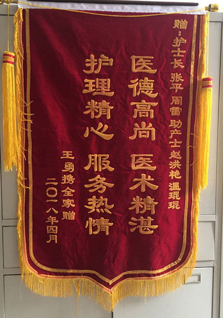 錦旗贈(zèng)我院護士長張平、周雷,助產(chǎn)士趙洪豔、溫琨琨