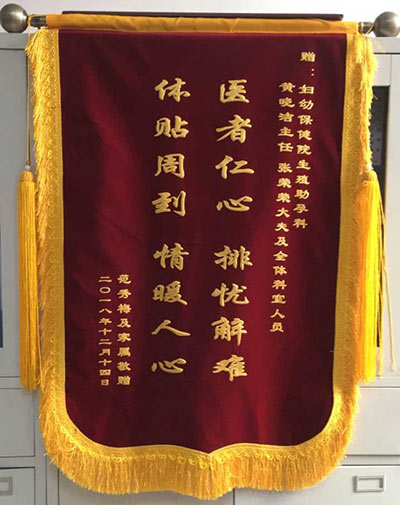 範秀梅贈錦旗感謝我院生殖醫學中心黃曉潔主任,張榮榮醫生及全體醫護人員