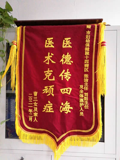 曹(cáo)三(sān)女贈錦(jǐn)旗感(gǎn)謝我院十四病區張潔、劉陽(yáng)及全體醫護人員