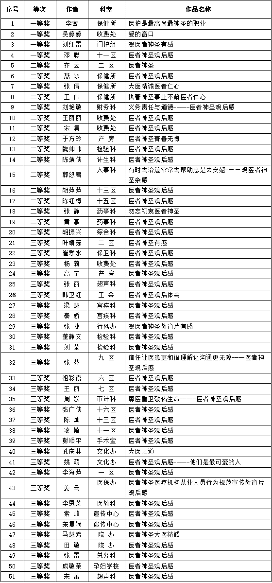 征文活動得到了廣大醫護人員(yuán)的積(jī)極參與,共收到稿件(jiàn)近450篇。經過征文(wén)評審(shěn)組(zǔ)認真審閱,擇優評選出一等獎4篇,二等(děng)獎16篇,三等獎31篇。評委一致認為(wéi),此次征文稿件(jiàn)水(shuǐ)準普遍較高,內容豐富,既有一定的理論思考,也能夠結(jié)合自身醫(yī)、技、護的工作實際有感而發,深刻詮釋“醫者神聖”的深(shēn)刻內涵,在推進醫院黨風廉政建設和行業作風(fēng)建設,提高醫務(wù)人員服務意識(shí),營造和(hé)諧醫患關係方麵有較強的教育(yù)和指導意義。