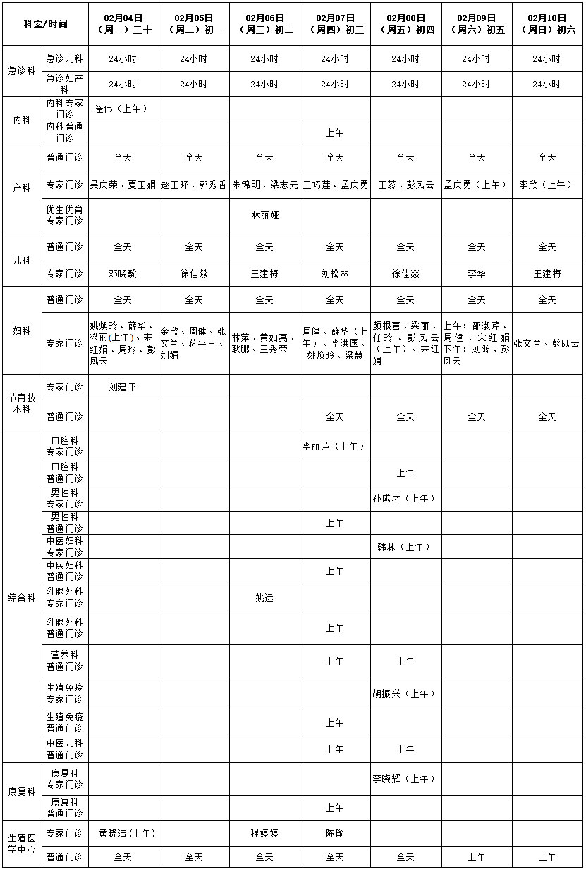 2019年春節期間門診值班表