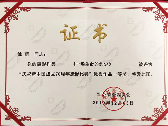 12月14日,第(dì)十八屆醫院院長論壇在南京隆重舉行。會上,江蘇省醫院協會公布(bù)了“慶祝新中國成立(lì)70周年攝影比賽”獲獎名單,全省共有來自(zì)65家單位的352幅攝影作品參與(yǔ)評選(xuǎn),徐州(zhōu)市婦(fù)幼(yòu)保健院宣傳科姚萌(méng)的攝影圖片《一(yī)場生命的約定》摘得桂冠,榮獲(huò)大(dà)賽(sài)一等(děng)獎。