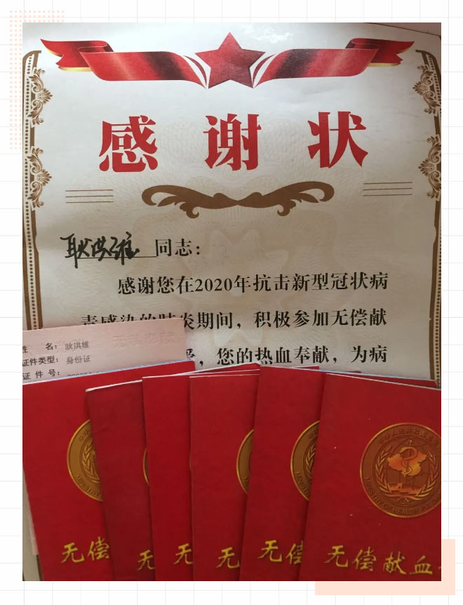 自大學畢業時起,耿(gěng)洪維已(yǐ)獻血10餘次,每次一過獻血安全期,她就會算著日子出現在血站。周圍的親友為此心疼不已,她卻不以為意:“我的工(gōng)作讓我知道(dào)這些血(xuè)危急時能救命,我身(shēn)體棒著呢,沒事兒,最多兩頓飯就補過來了”。