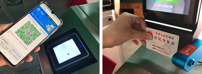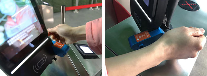 通過智能閘機時(shí),將準備好的蘇康碼或已與蘇康碼綁(bǎng)定的身份證對準掃碼區,蘇康碼驗證通過後按語音提示伸出(chū)手腕對準右邊測溫麵板進行體溫檢測。