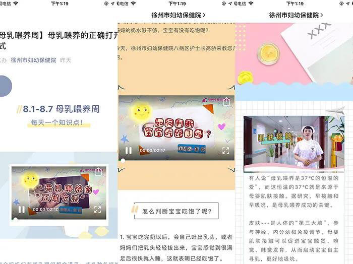 1.廣泛開展(zhǎn)宣傳倡導,向社會(huì)公眾傳播母乳喂養的重要意義,普及喂養知識,營造(zào)關(guān)心支持母乳喂養的良好社會氛圍。從7月28號醫院公眾號母乳(rǔ)喂養周活動啟動,到8月1日至7日,由孕(yùn)婦學校校長、產科(kē)各病區及(jí)新生兒科7位護士長(zhǎng)組成母乳喂養知識宣講團,通過官方(fāng)微信公眾(zhòng)號每天發布,共8個關於母乳喂養知識的科普短視頻。科(kē)普短視頻從母乳喂養的好處,到如何實現成功母乳喂養的知識方法和(hé)技能,如(rú)產後早期母嬰肌膚接觸的作用、正確哺乳(rǔ)姿勢體(tǐ)位、寶寶正確含接、母乳(rǔ)的保存、如何(hé)防止哺(bǔ)乳時乳頭疼痛等,為廣大孕產婦(fù)及家屬展現了一場母乳喂(wèi)養知識的盛宴,據統計,共有(yǒu)受眾萬餘人,增強了孕產婦堅持母乳(rǔ)喂養的信(xìn)心,保障了成功母(mǔ)乳喂養,得到了廣(guǎng)泛稱讚。