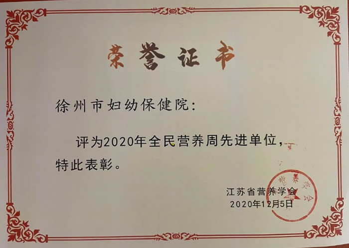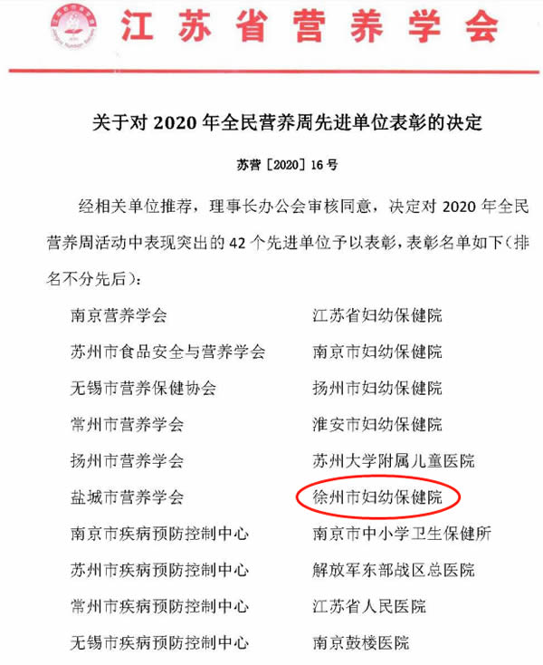 2020年12月5日,江蘇省營養學會六屆三次理事會議暨六次常務理事會議在(zài)寧(níng)召開。會議表彰了全省42家“2020年(nián)全(quán)民營養周先進單(dān)位”,徐州市婦幼保健院位列(liè)其中,這已是醫院連續兩年獲此殊榮。