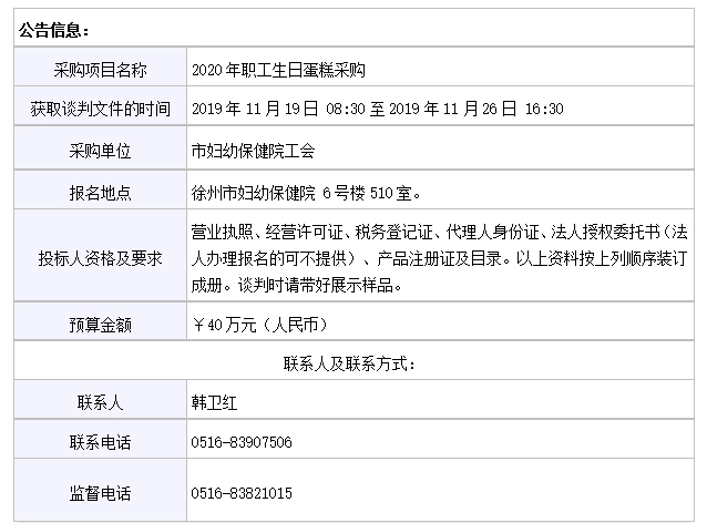 市婦幼保健院2020年職工(gōng)生日蛋糕供(gòng)貨采購競爭性談判招標公告