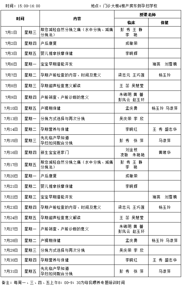 徐州市婦幼保健院2015年7月孕婦學校(xiào)課程安排