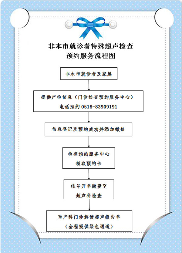 非本市孕產(chǎn)婦(fù)預約以上兩種(zhǒng)特殊檢查超聲(shēng),因各(gè)種(zhǒng)原因無(wú)法親自來院(yuàn)開單繳費現場預約,可(kě)撥打門診檢查預約服務中心預約電話(0516)83909191,撥打時間上午:8:30-11:30,下午:02:00-04:30。電話中需提供近期產檢信息(如末次月經(jīng)、孕周、單胎等)。